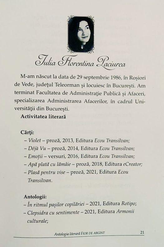 În data de 25 februarie 2024 am semnalat faptul – pe Facebook – că (a)numita Iulia – Florentina Paciurea a publicat, în antologia „Fior de argint” - recent apărută la Editura „Contraste culturale” din Giurgiu, coordinator Izabela Tănasă – un CV neconform cu realitatea.