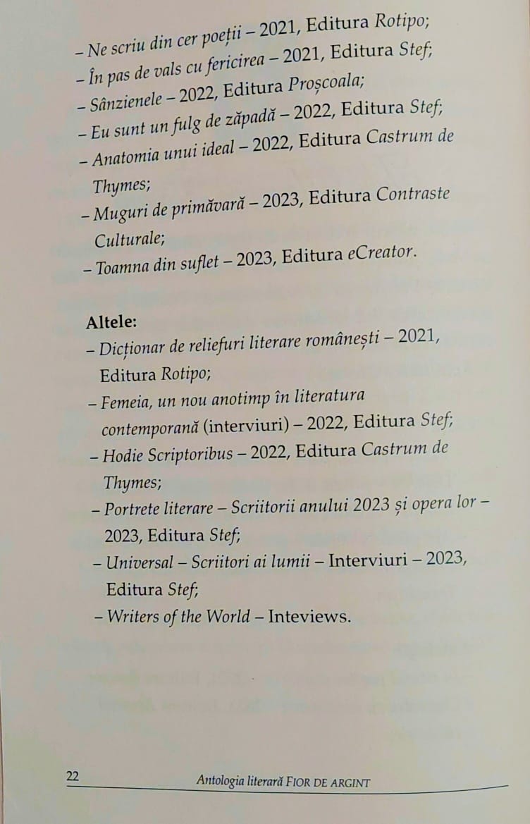 Singurele ei colaborări - tipărite - cu Editura Ecreator au fost/sunt antologiile „Toamna din suflet” și „Iarna din suflet”.